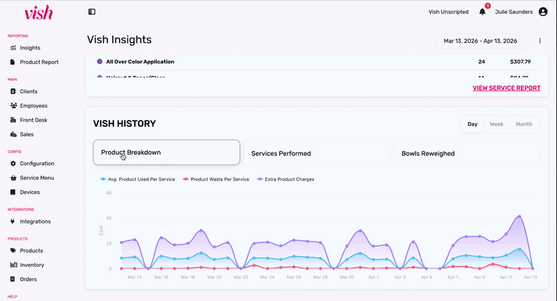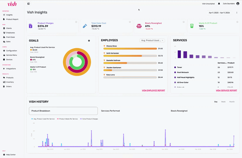 You brought Vish into your salon for a reason, to eliminate color waste and capture forgotten charges. Now, you can track those specific objectives directly on your home screen.